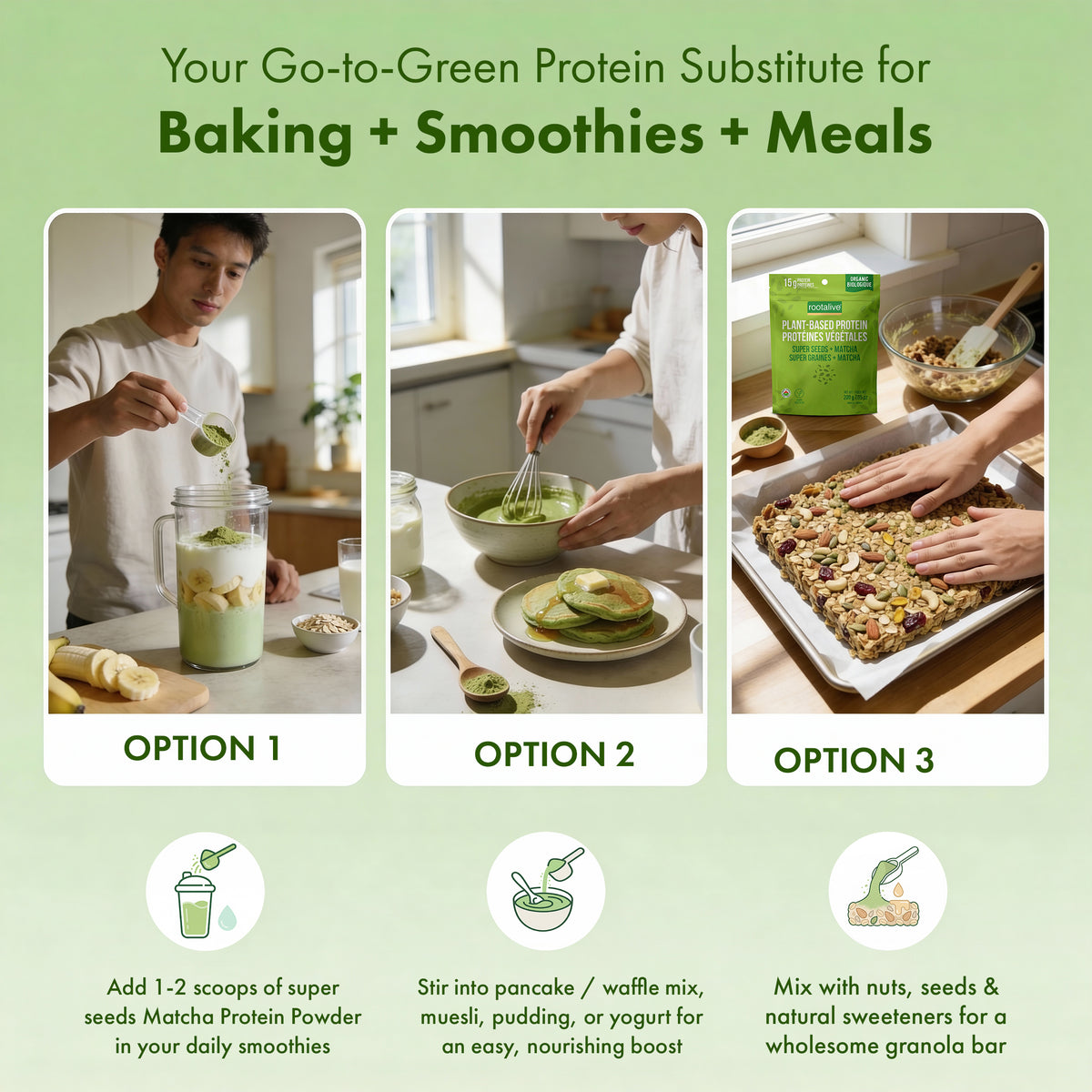 • 🍵 Smooth, Versatile & Easy to Use Perfect for shakes or smoothies, matcha-style lattes, yogurt or parfaits, pancakes, waffles & crepes, or mixed with plant-based drinks like oat or soy milk.